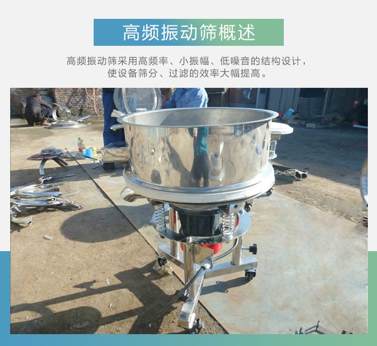 高頻篩也叫高頻振動篩,采用高頻率、小振幅、低噪音的結構設計,使細粒物料在篩面上高速振蕩,破壞了漿液的表面張力,增加了物料與篩孔接觸的頻率,使設備篩分、過濾的效率大幅提高,廣泛應用于食品、醫藥、化工、磨料、陶瓷、礦業、顏料、冶金、地質、國防、電子等行業的漿料、粉料、顆粒生產的分級、過濾。方便的活動車架在工作場所可以隨意移動,不用進行復雜的設備安裝,高低可調、操作簡單、經久耐用。