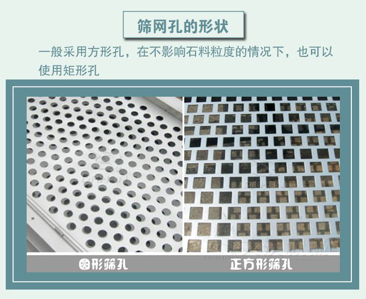 篩網(wǎng)一般采用方形孔,小網(wǎng)眼是用來防止堵塞孔網(wǎng)的,如果孔塞嚴重,在不影響石料粒度的情況下,也可以使用矩形孔。但是,從使用周期的角度來看,必須注意網(wǎng)眼的方向,否則會影響篩網(wǎng)的使用周期。