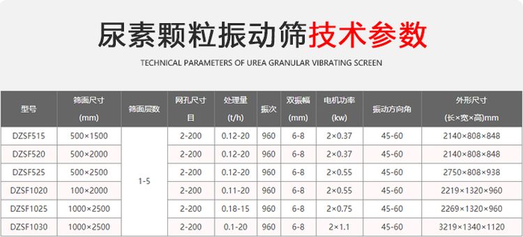 尿素顆粒振動篩有:DZSF-515、DZSF-520、DZSF-1020、DZSF-1025、DZSF-1030、DZSF-1035、DZSF-1540等長、寬、高不同的機型。