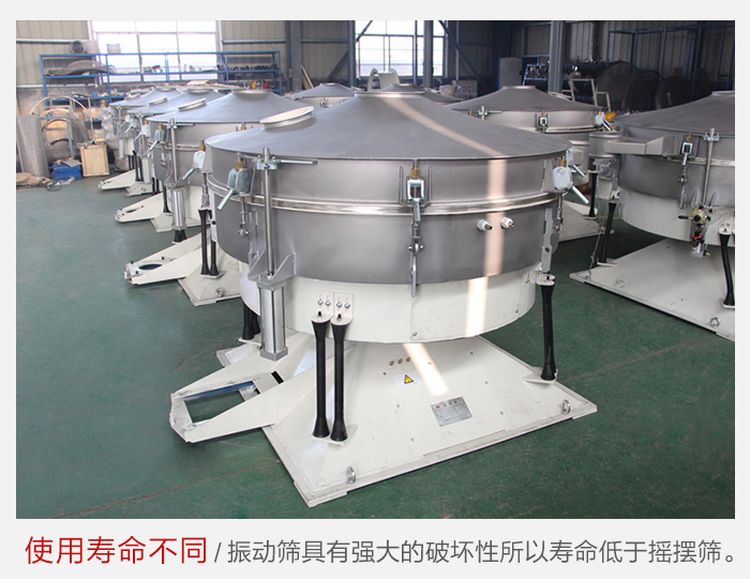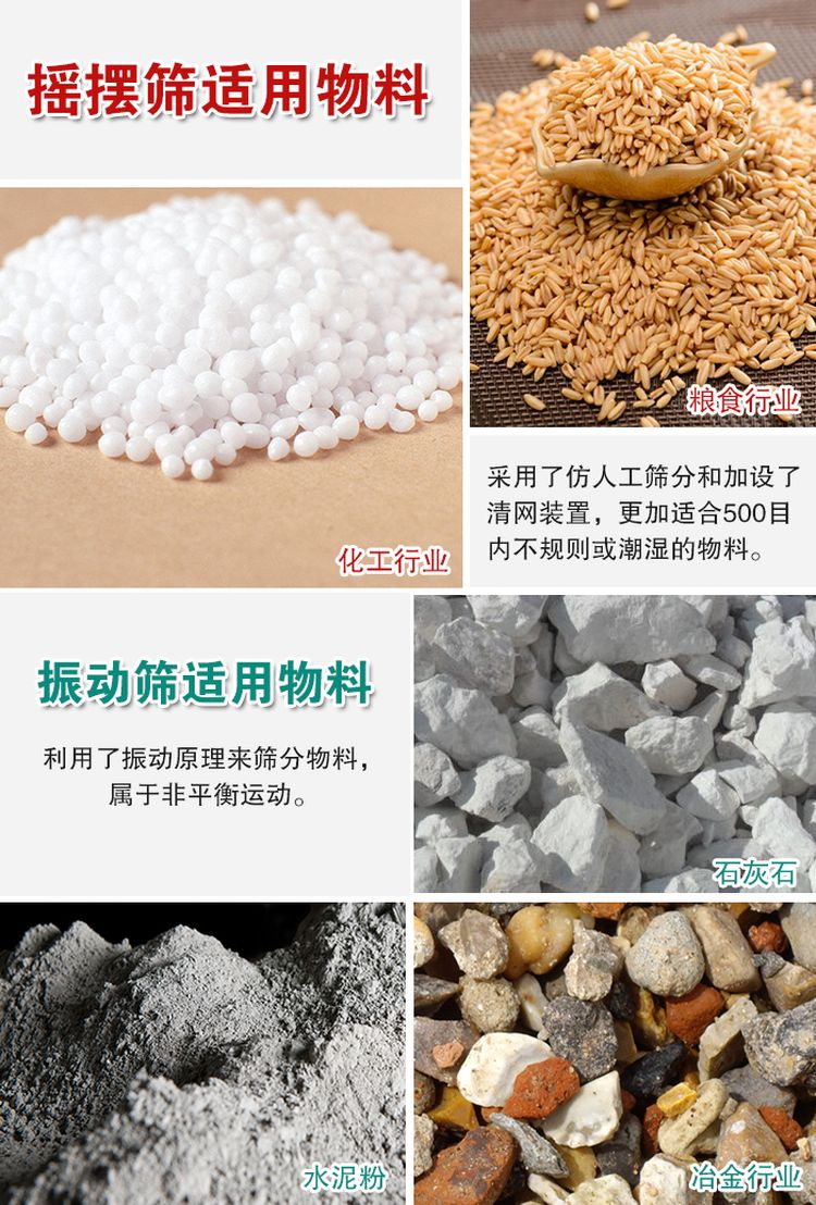 搖擺篩由于采用了仿人工篩分和加設了清網裝置,所以更加適合500目內不規則或潮濕的物料,克服了普通振動篩的堵網風險,而振動篩屬于非平衡破壞暴力運動,利用了振動原理來篩分物料,所以有時還會破壞物料,所以對于一些顆粒狀結晶焦脆物料,建議使用搖擺篩,其篩分精度可達95% 以上。