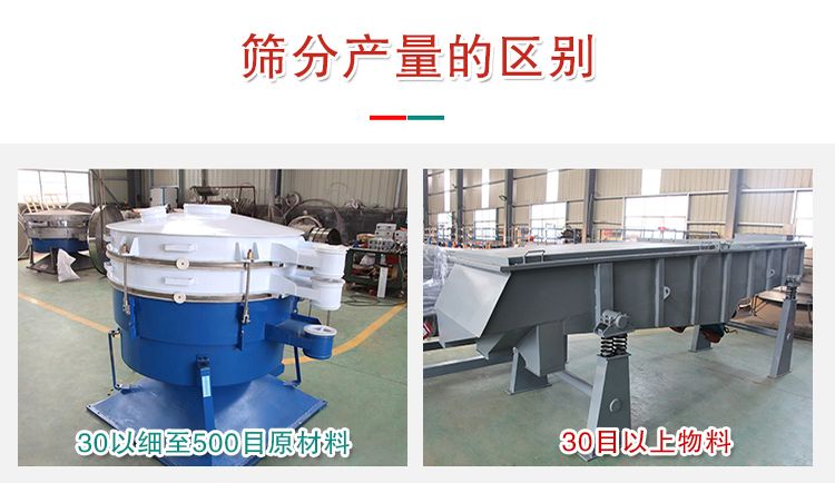 針對30目以粗上物料而言,振動篩和搖擺篩產量基本相同,對30以細至500目原材料來說,搖擺篩的生產量則大大高過振動篩,一般為振動篩的5—10倍。