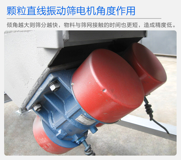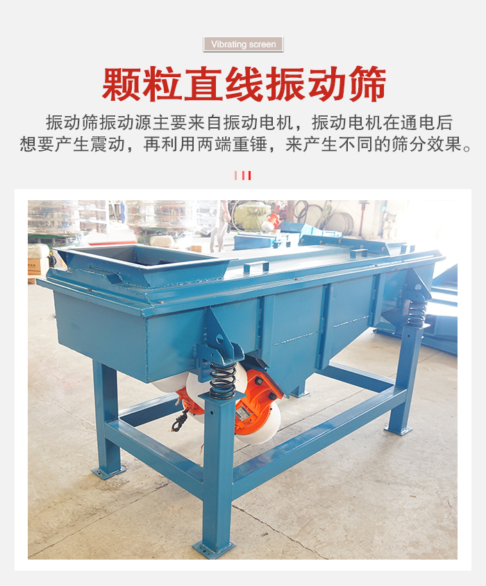 顆粒直線振動(dòng)篩振動(dòng)源主要來自振動(dòng)電機(jī),振動(dòng)電機(jī)在通電后想要產(chǎn)生震動(dòng),再利用兩端重錘,來產(chǎn)生不同的篩分效果。