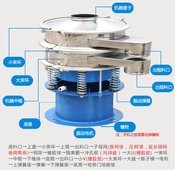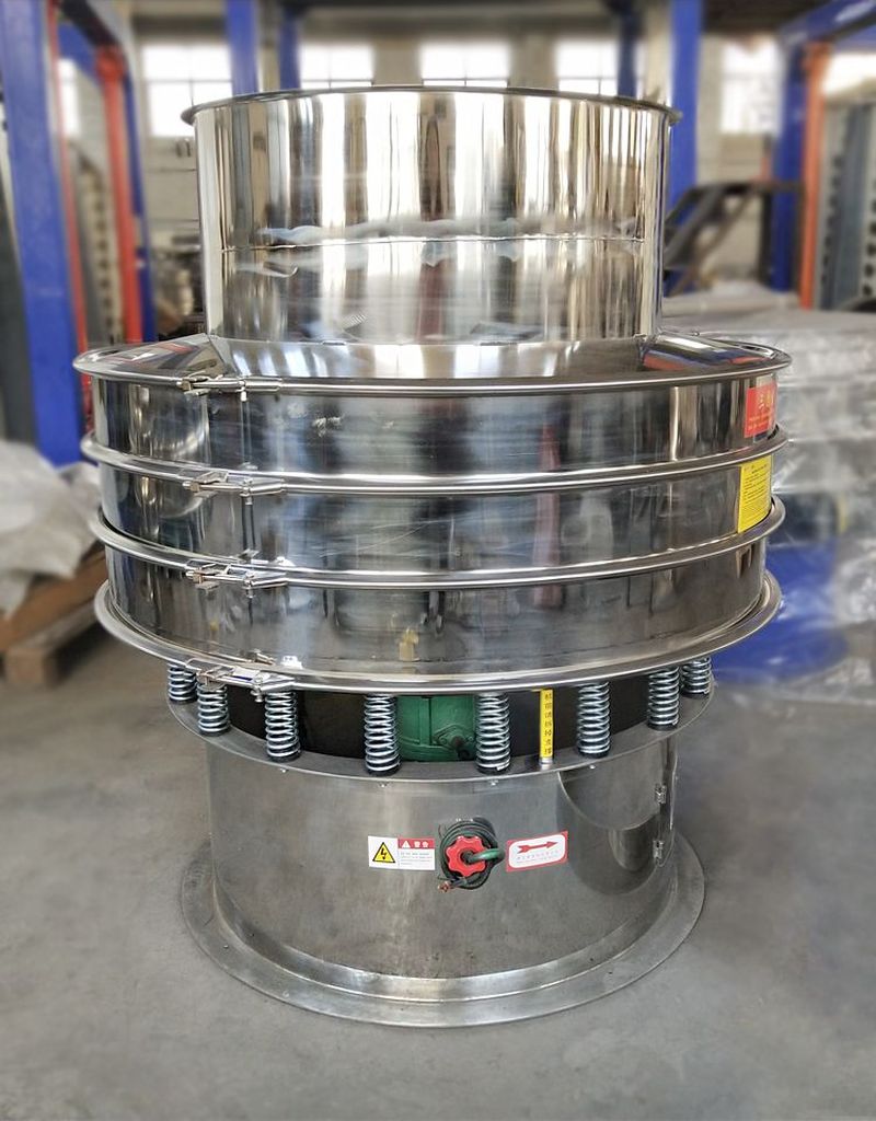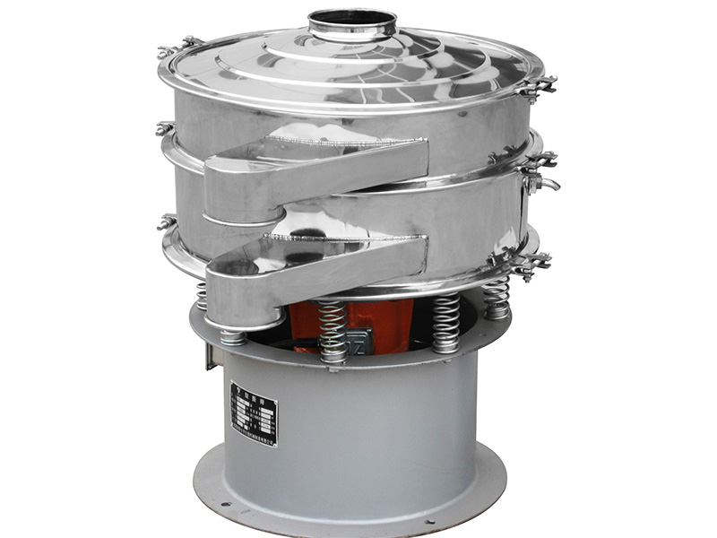 旋振篩是一種高精度細粉篩分機械,其噪音低、效率高,快速換網只需3-5分鐘,全封閉結構,適用于粒、粉、粘液等物料的篩分過濾。旋振篩是由直立式振動電機作激振源,電機上、下兩端安裝有偏心重錘,將電機的旋轉運動轉變為水平、垂直、傾斜的三次元運動,再把這個運動傳遞給篩面。調節電機上、下兩端的相位角,可以改變物料在篩面上的運動軌跡。