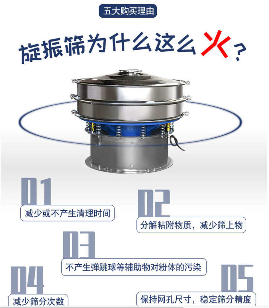 篩選范圍廣--只有系列三次元旋振篩能分選如此廣的原料范圍:任何顆粒、細粉、漿液都可以篩選。篩分細500目(28微米),過濾細5微米。網孔防堵塞--三次元振動功能及自動清理堵網裝置把堵網幾率降到小。 單層或多層分選--每臺旋振篩可選一至五層篩網,能同時進行二到六個等級的分選或過濾。