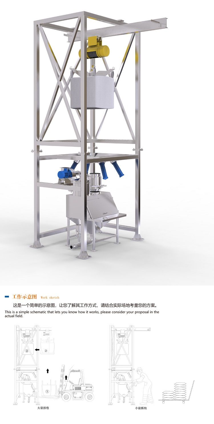 主體結構:卸料站框架支撐結構、噸袋起重裝置、噸袋吊架、噸袋支撐按摩板、袋口控制閥、密封裝置。
