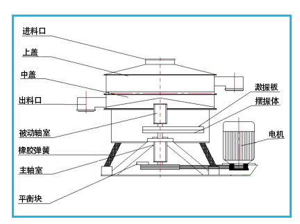 搖擺篩分機的基本回轉運動與人工篩分相似,偏心率從25到40mm可調,低速V型皮帶驅動從120到360rpm可調。每一種物料的停留時間可以通過搖擺篩的徑向與切角朝驅動軸線方向進行調整。因此建立水平與拋擲三維翻滾運動。物料從中心到外緣在整個篩面上均勻分散,從而以螺旋運動往軸向傳播。細小顆料從而完成了整個篩分過程。