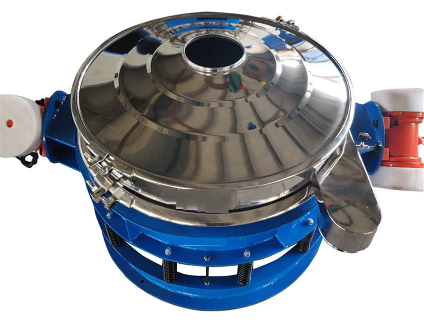 直排篩的作用原理是振動電機軸上下端的兩組偏心塊(不平衡偏心塊),將振動電機的旋轉運動變為水平、垂直、傾斜以及離心作用的多作用力重疊,再將這種作用力傳遞給篩面。改變上下偏心塊的相位角和可以改變激振力的大小和物料的運動軌跡。