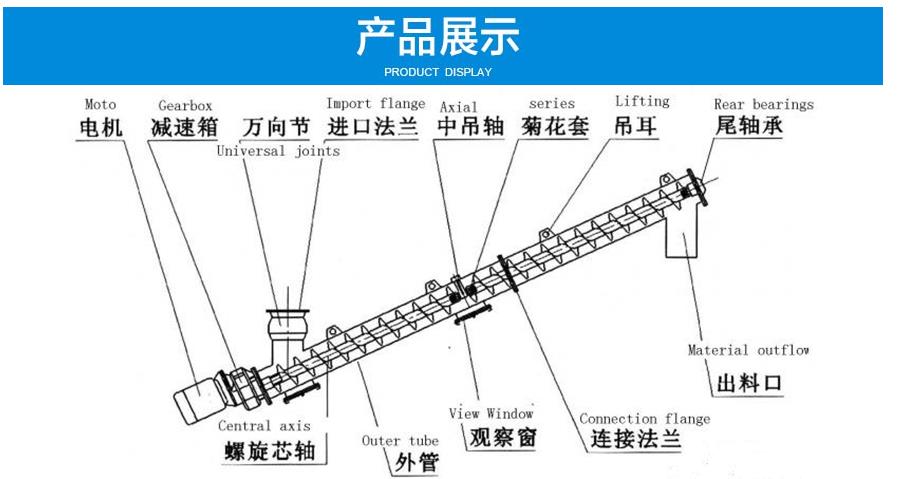 LS型螺旋輸送機是利用旋轉(zhuǎn)的螺旋將被輸送的物料沿固定的機殼內(nèi)推移而進行輸送工作,頭部及尾部軸承移至殼體外,吊軸承采用滑動軸承設(shè)有防塵密封裝置,軸瓦一般采用粉末冶金,輸送水泥采用毛氈軸瓦,吊軸和螺旋軸采用滑塊連接。