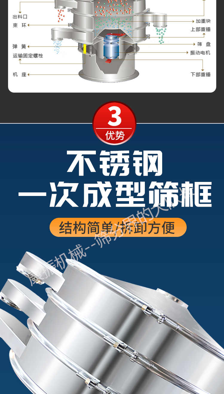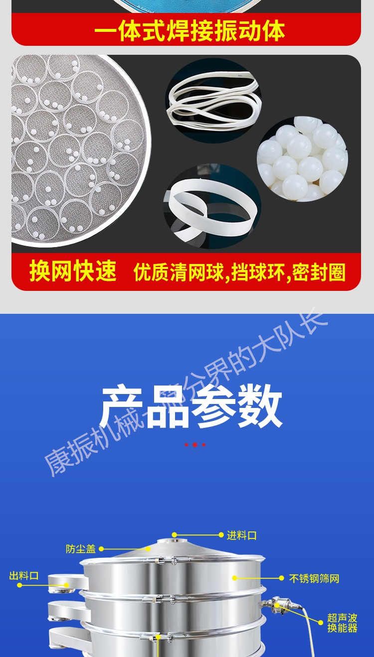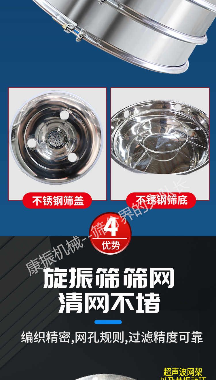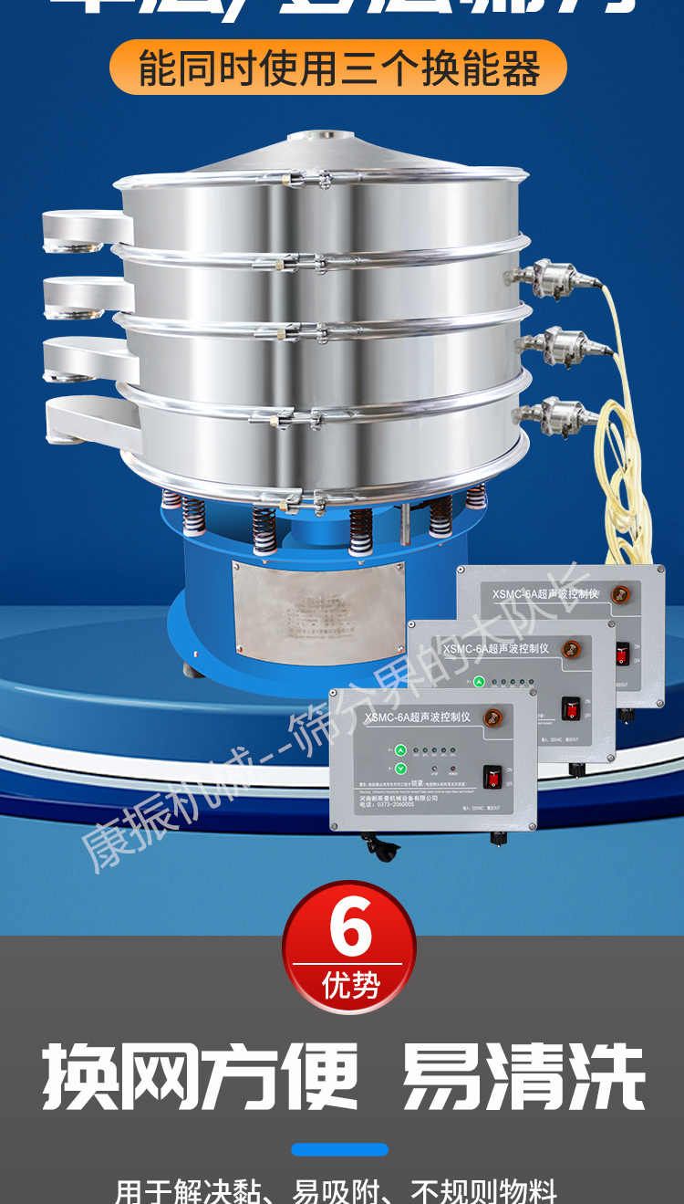 超聲波振動篩是在旋振篩的基礎上引入了超聲波清網裝置,通過將220V、50Hz或110V、60Hz電能轉化為18KHz的高頻電能,輸入超聲換能器,將其變成18KHz機械振動,從而達到高篩分和迅速清網的目的,使超微細粉篩分成為易事。該系統在傳統的振動篩基礎上在篩網上引入一個低振幅、高頻率的超聲振動波(機械波),以改善超微細粉體的篩分性能。特別適合高附加值精細粉體的用戶使用。超聲波篩分系統是一種簡單實用、可靠的篩分系統,是當前網孔堵塞的有效的解決方法。可廣泛應用于制藥、冶金、化工、選礦、食品等要求精細篩分過濾的行業,篩分過濾精度高,有效解決因團聚、靜電、強吸附性卡堵網孔等篩分難題,是國內篩分行業的一項重大技術突破。