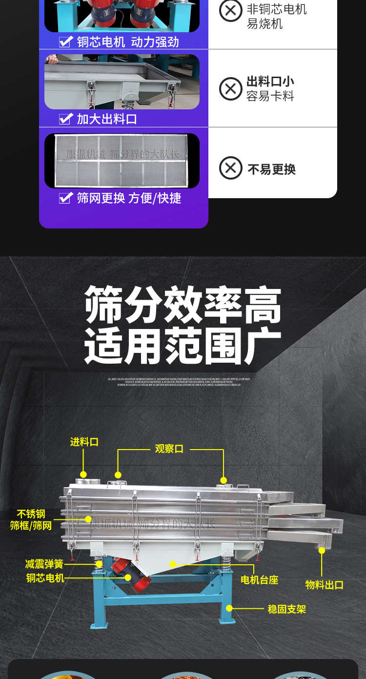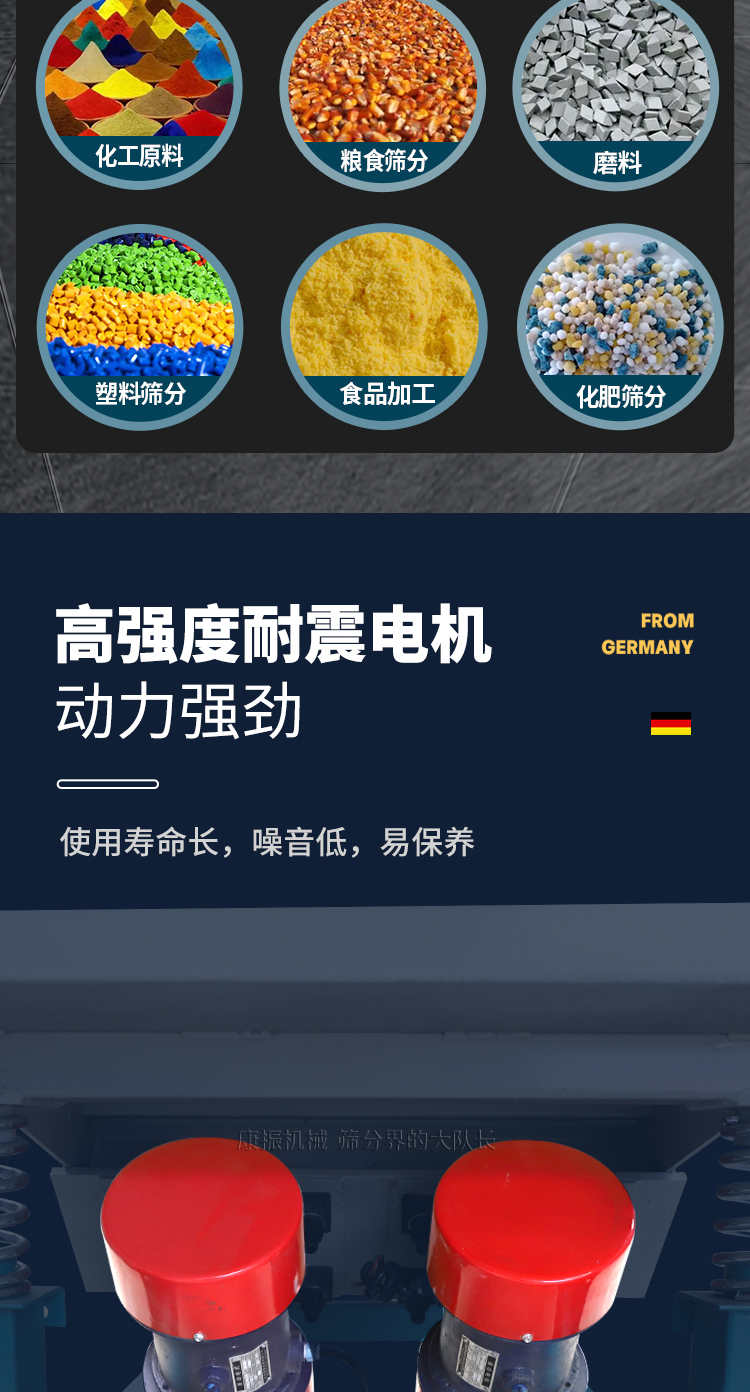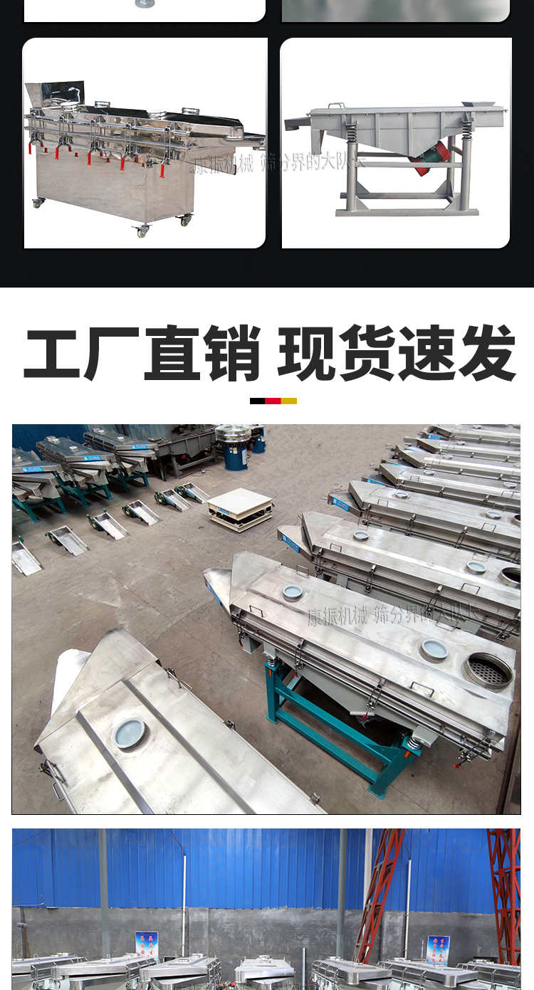對粉狀、顆粒狀物料的篩選和分級,廣泛應用于塑料、磨料、化工、醫藥、建材、糧食、炭素、化肥等行業.直線振動篩(直線篩)系新型的篩分設備,廣泛用于礦山、煤炭、冶煉、建材、耐火材料、輕工、化工等行業。