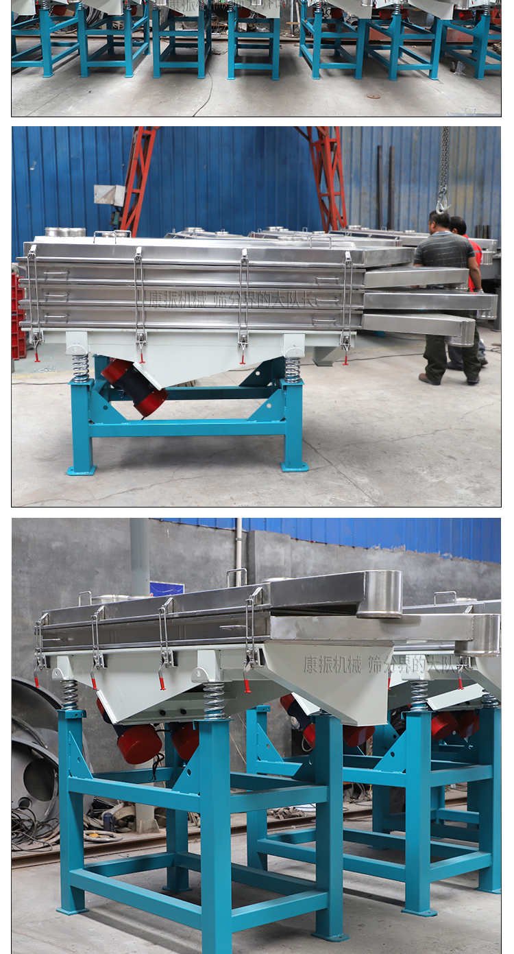 直線振動篩利用振動電機激振作為振動源,使物料在篩網上被拋起,同時向前作直線運動,物料從給料機均勻地進入篩分機的進料口,通過多層篩網產生數種規格的篩上物、篩下物、分別從各自的出口排出。具有耗能低、產量高、結構簡單、易維修、全封閉結構,無粉塵溢散,自動排料,更適合于流水線作業。