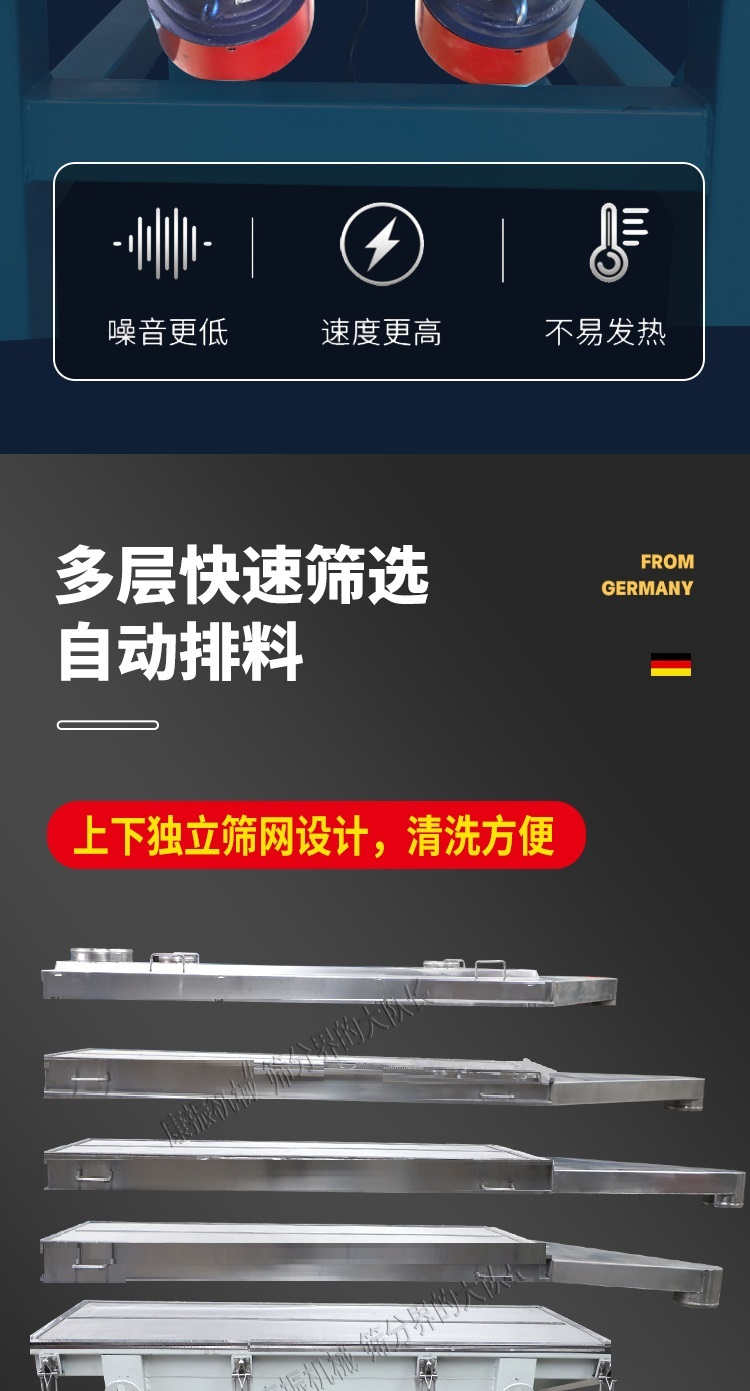 直線振動篩采用雙振動電機驅動,當兩臺振動電機做同步、反缶旋轉時,其偏心塊所產生的激振力在平行于電機軸線的方向相互抵消,在垂直于電機軸的方向疊為一合力,因此振動篩的運動軌跡為一直線。其兩電機軸相對篩面有一傾角,在激振力和物料自重力的合力作用下,物料在篩面上被拋起跳躍式向前作直線運動,從而達到對物料進行篩選和分級的目的??捎糜诹魉€中實現自動化作業。具有能耗低、效率高、結構簡單、易維修、全封閉結構無粉塵溢散的特點。篩分目數325目,可篩分出7種不同粒度的物料。